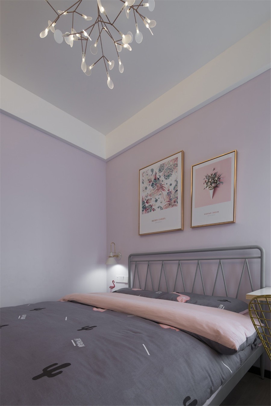 不同于主臥的素雅,少女心滿(mǎn)滿(mǎn)的女兒房, 床頭掛畫(huà),鐵藝床與火烈鳥(niǎo)床單,INS風(fēng)十足。
