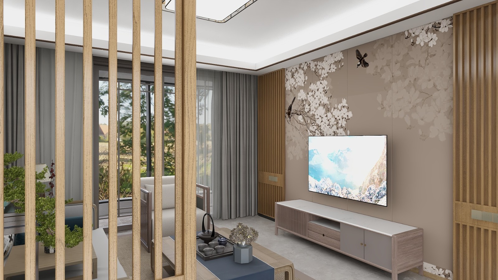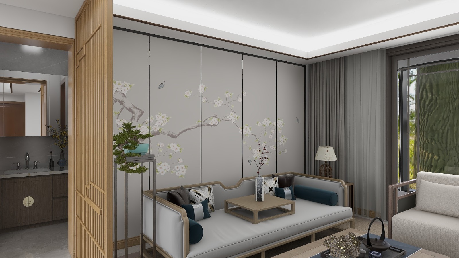 沙發(fā)背景墻融入了中式的意境與電視背景墻向虎銀,襯托出中式的韻味。