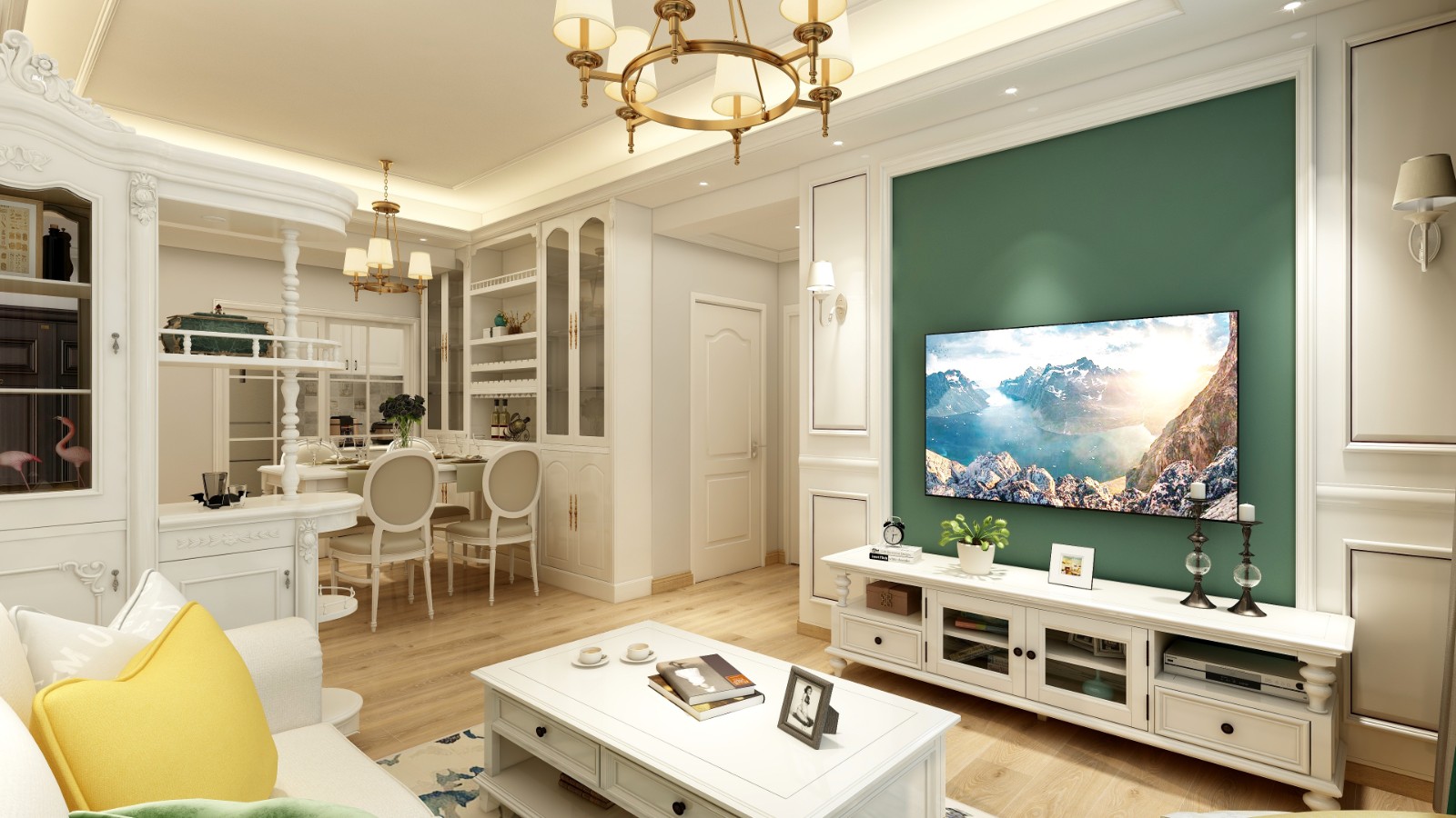 電視背景墻以簡潔干練的石膏線打造,讓空間層次更加豐滿,輔以兩盞時尚壁燈,營造精致優雅的氛圍。