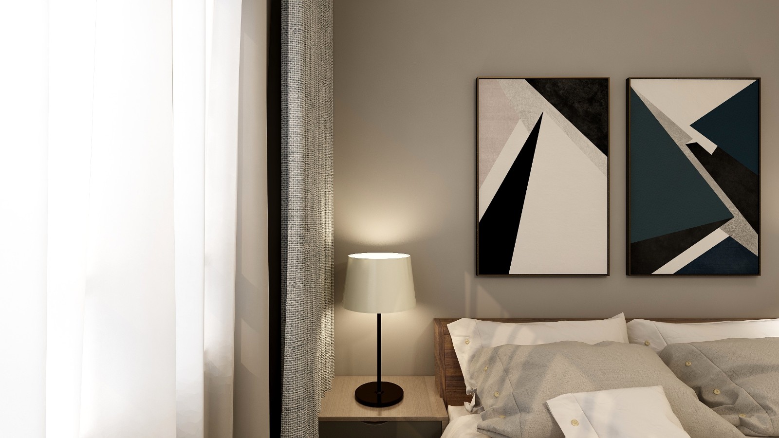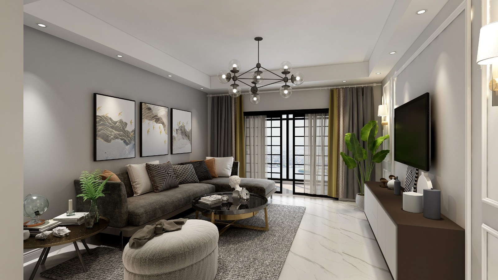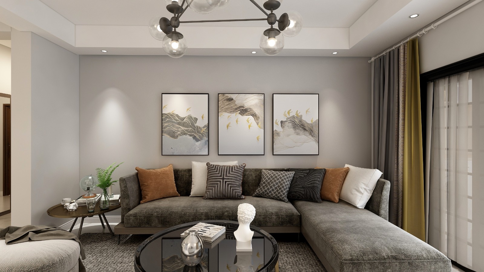 淺灰色的背景墻面漆,時尚動感的簡約風掛畫,十分具有現代風。一絲工業元素的棕灰色沙發搭配黑色的茶幾,深灰色加入一抹亮色黃,使空間的流行元素渲染出來。
